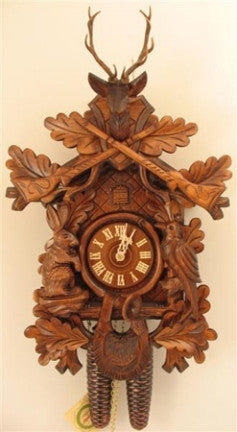 This large and beautifully-carved cuckoo clock speaks of old-world charm and craftsmanship. The carving shows a still life of the life of a hunter. It's dimensional carvings include hunting trophies, live game (including a beautifully carved bird and rabbit), a hunting horn, ammunition pouch, and guns, all surrounded by carved oak leaves.