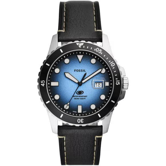 Distinguished by its robust design and sophisticated appeal, the Fossil® Analogue 'Fossil Blue' Men's Watch FS5960 is an embodiment of the contemporary man's style. Crafted for the casual yet discerning wearer, this timepiece features a versatile 42mm round stainless steel case paired with a 21mm black leather strap that affirms comfort alongside timeless fashion. The silver case highlights a turnable bezel, framing a compelling blue dial that is protected by a durable mineral glass window.