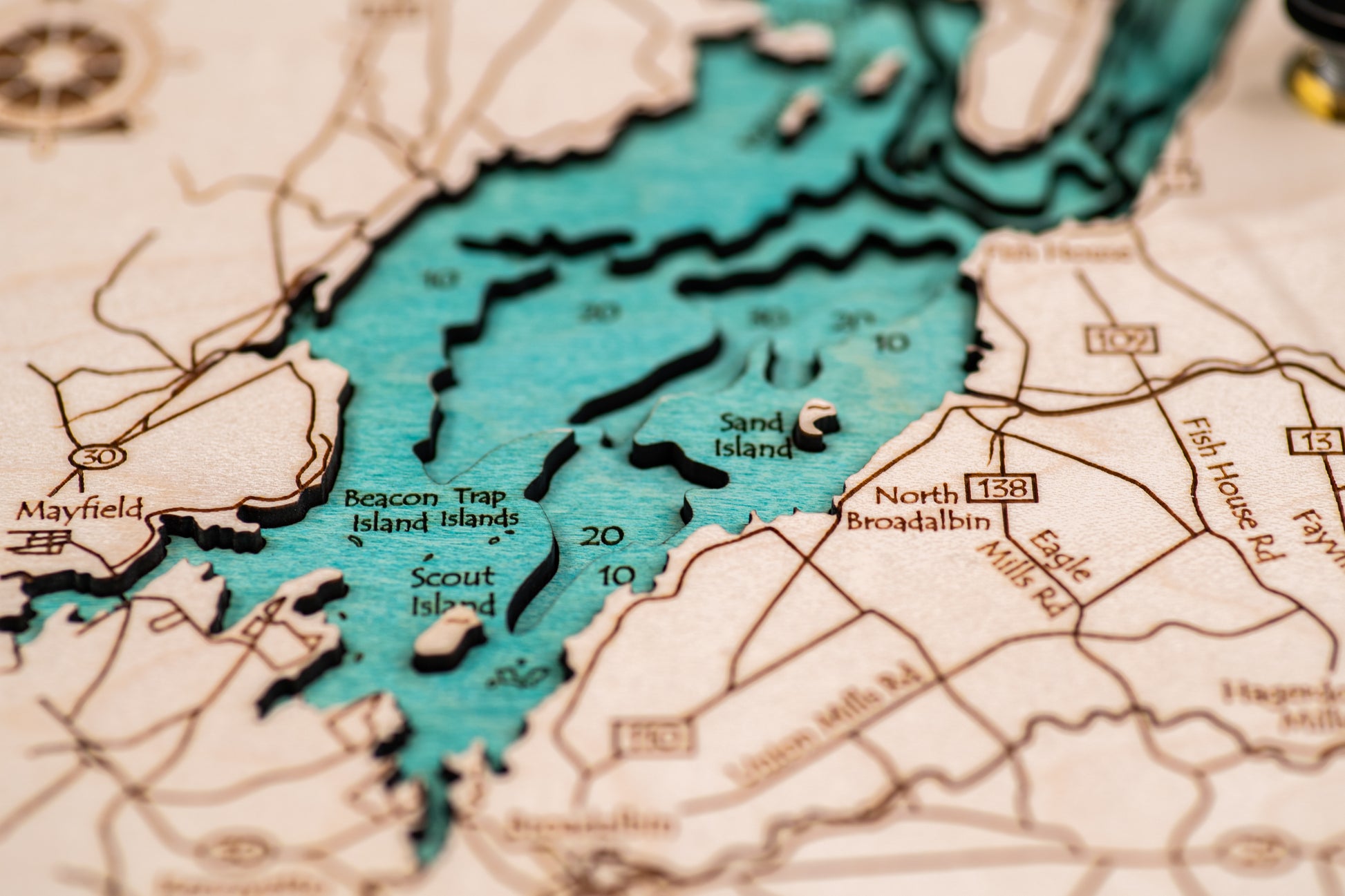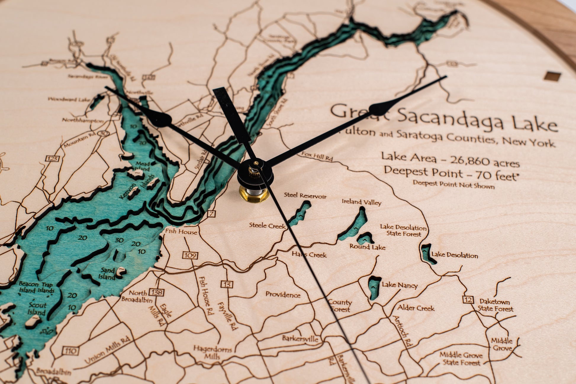 We stock many local lakes including Great Sacandaga Lake in NY and other Adirondack Lakes. They are made in high relief using a multi-layer design and are cut using a state-of-the-art laser. They have a Maple Dial with a cherry outside ring. 100% American Made.