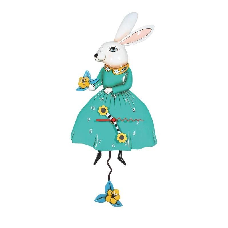 This battery-operated clock requires just one AA battery to keep time with its unique leaf and flower pendulum. The clock hands, pendulum, and the bunny's bouquet are adorned with beautiful flower accents, adding a touch of elegance and playfulness to the design.